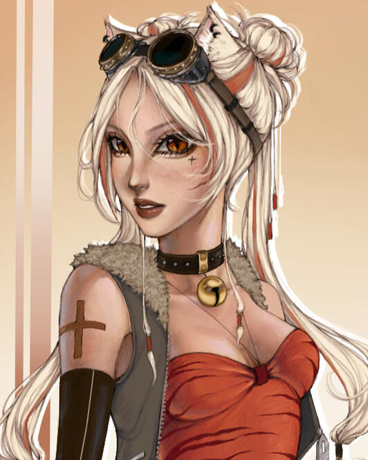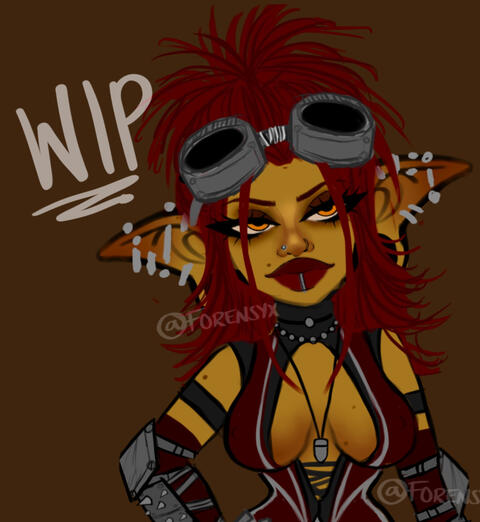 name : cherry bombshelluniverse : world of warcraftdescriptors : goblin mercenary ; racing enthusiast ; pin-up model ; mechanicart by : forensyx (me)